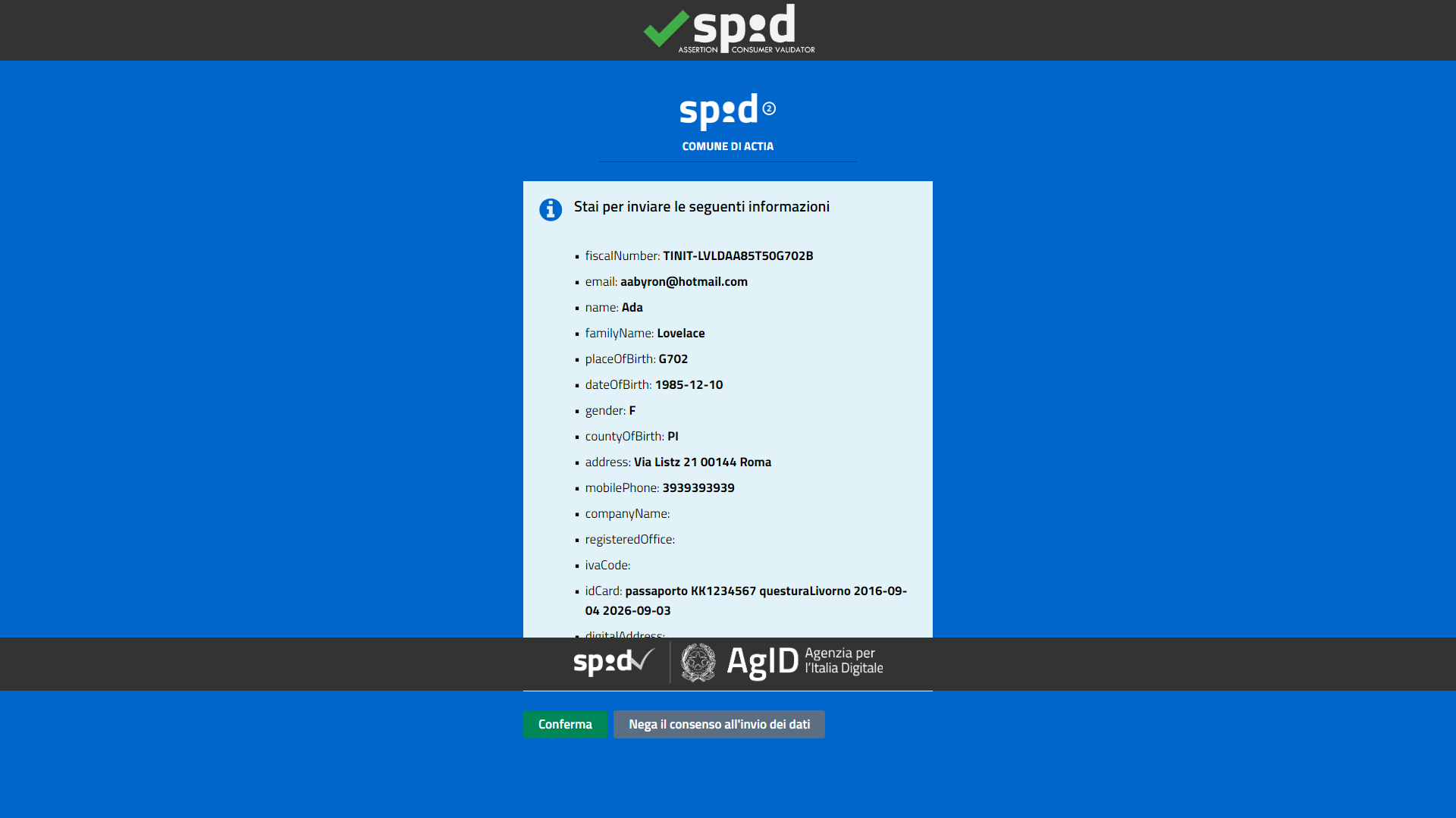 Verrà fornito un riepilogo dei proprio dati, proseguire cliccando su “Conferma”.