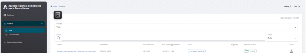 In caso invece di accesso come operatore addetto a gestire le richieste pervenute, nel menù di sinistra, si potrà accedere alla pagina “Pratiche ricevute”.