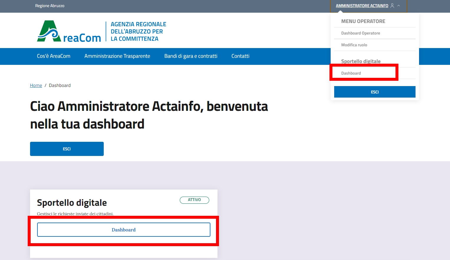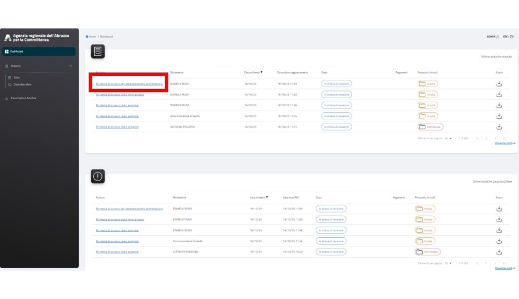 Una volta eseguito il login si accede all’area riservata nella pagina di dashboard, automaticamente come operatore. Qui potrete accedere alle pratiche sia dalla pagina principale che dal menù in alto a destra.