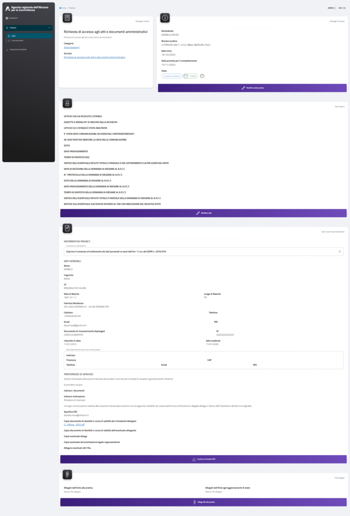 Si aprirà una pagina con il Modulo compilato dal richiedente e tutti i campi che possono essere integrati dall’operatore per la compilazione del registro FOIA.
