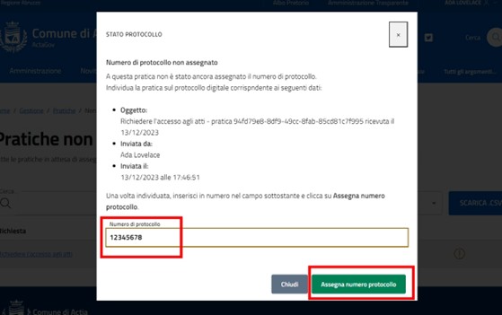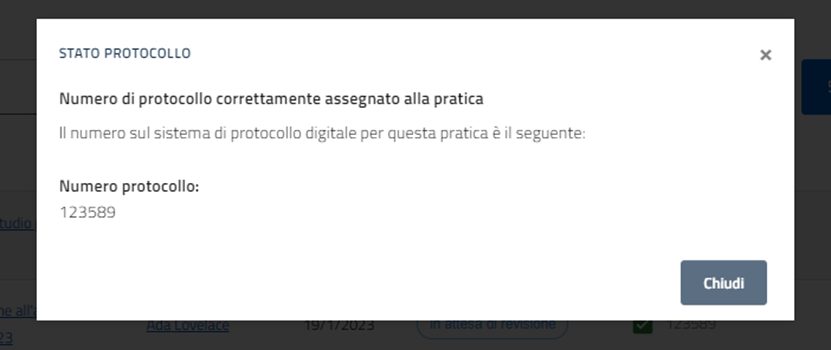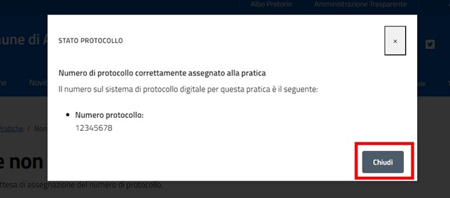 Infine premere “Chiudi” sulla nuova finestra. Nella pagina principale comparirà il numero di protocollo assegnato.