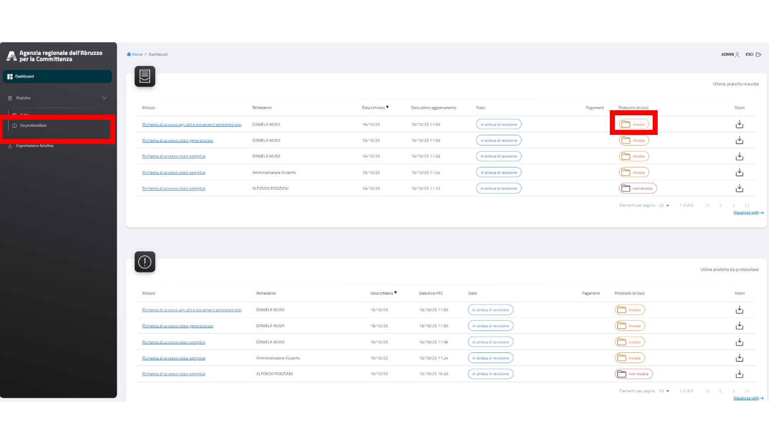Un eventuale operatore potrà accedere al menù “Pratiche da protocollare” dove appunto registrare il numero di protocollo assegnato alla mail giunta all’Ente tramite Sportello Digitale, cliccando su inviata e assegnando appunto poi il numero.