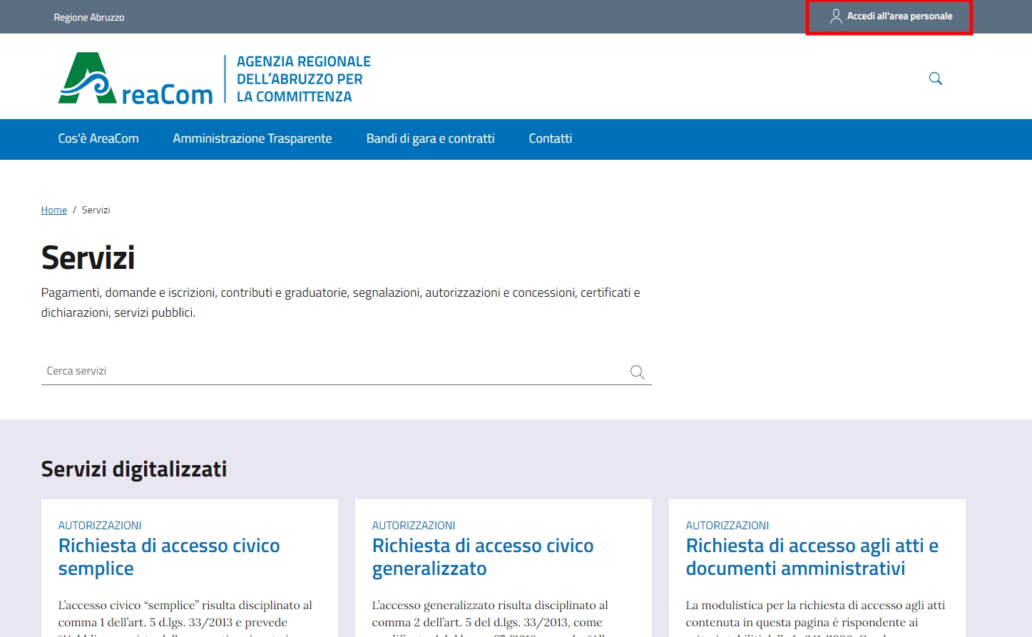 Una volta abilitato, l’operatore potrà fare accesso nell’area riservata al link https://servizi.nome-ente.it e cliccando su “Accedi” in alto a destra.