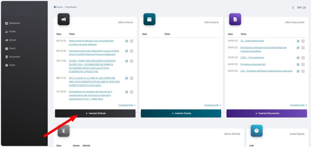 Una volta entrati nelle varie dashboard, per tornare alle pagine del sito bisogna cliccare sul logo dell’Ente in alto a sinistra. Clicca su “Inserisci articolo” o sulla scritta “Home” sempre in alto.