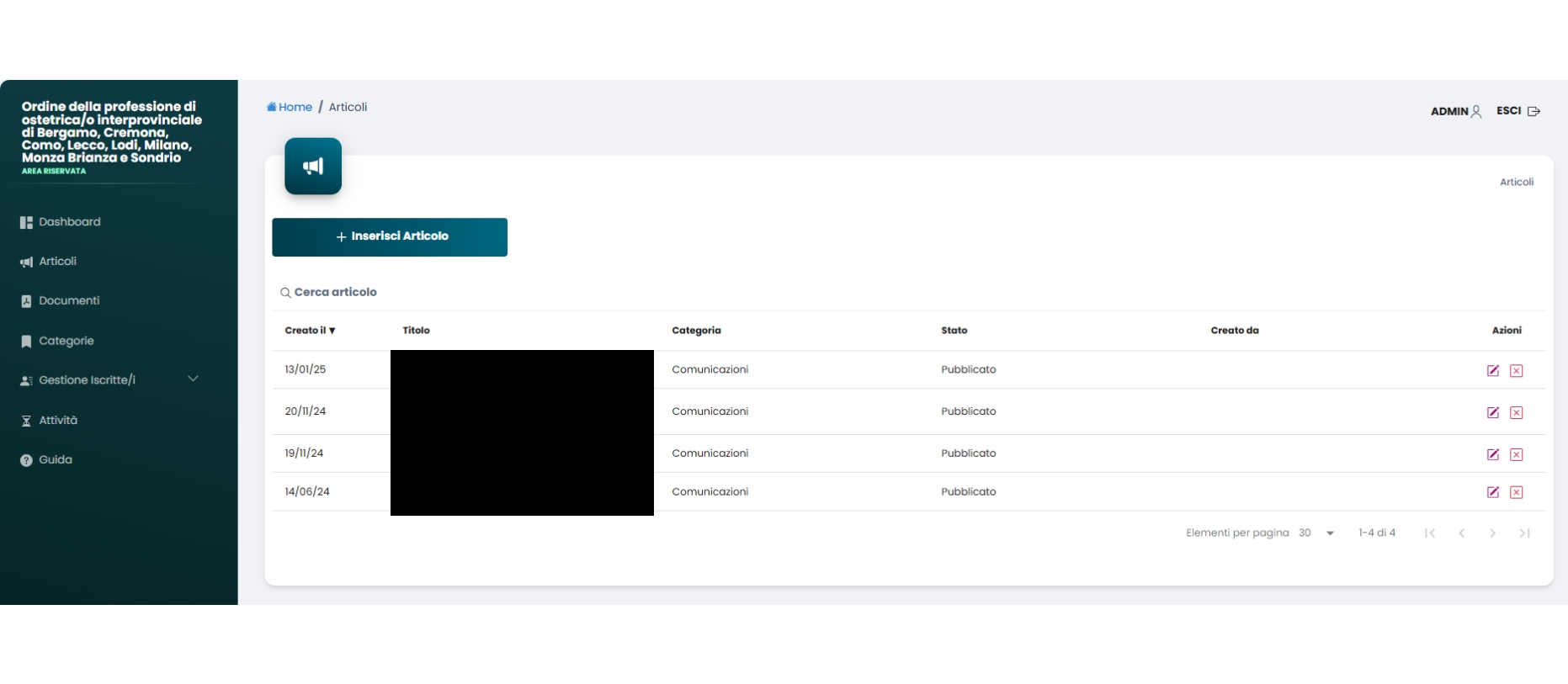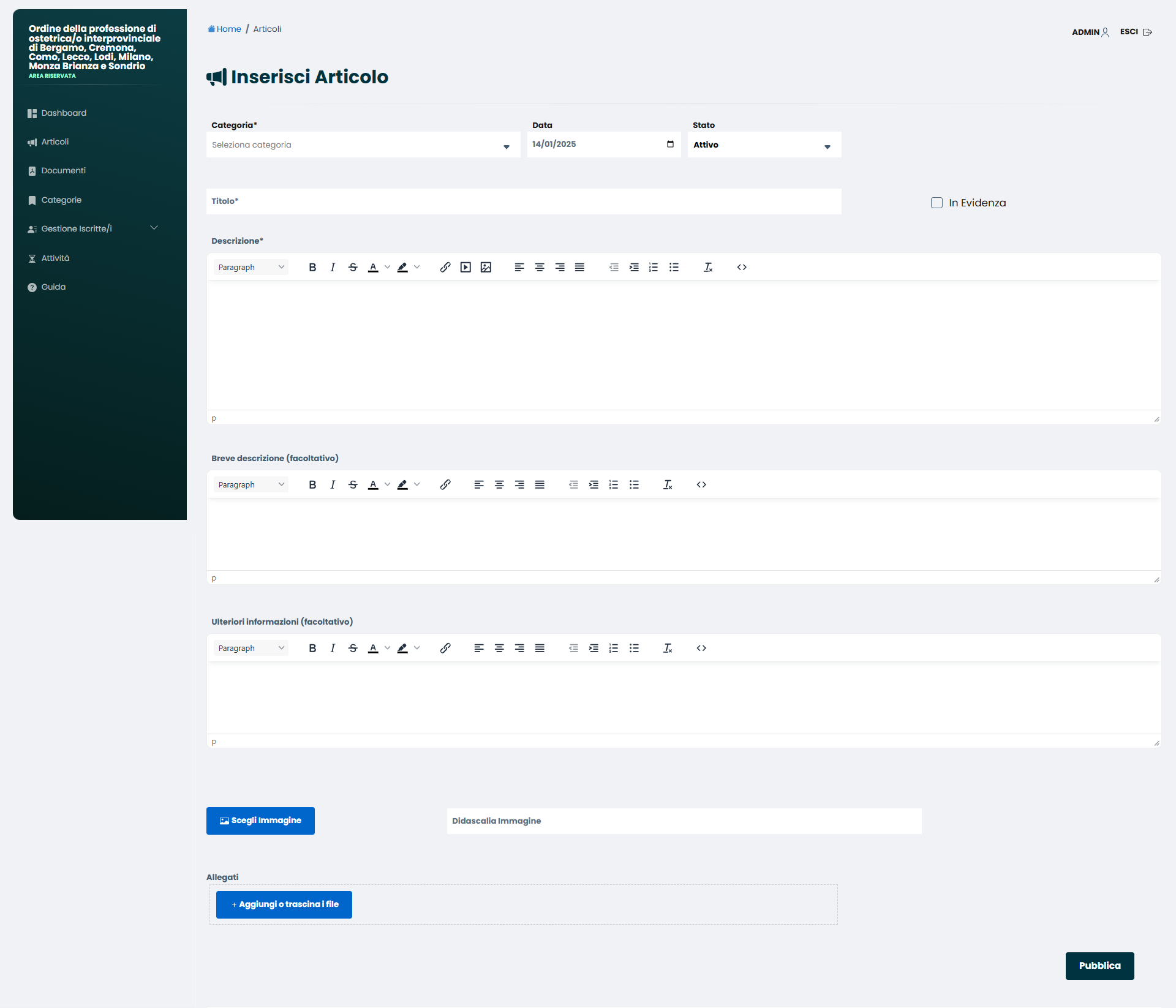 Cliccando invece su “Inserisci articolo”, è possibile crearne uno nuovo riempiendo i vari campi.