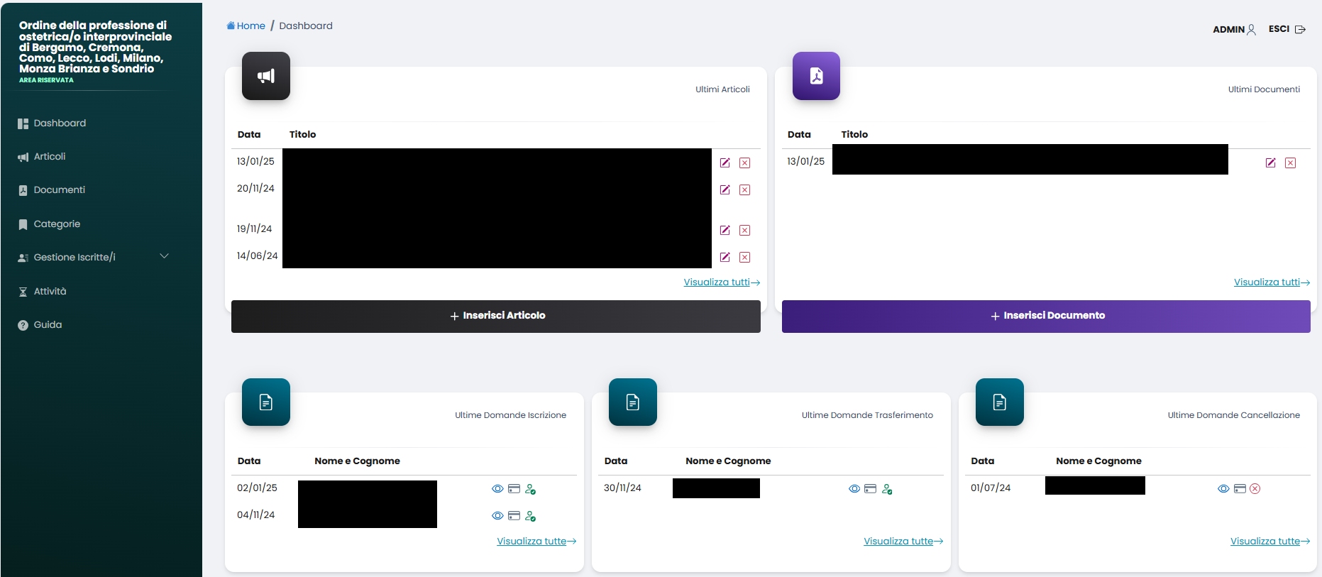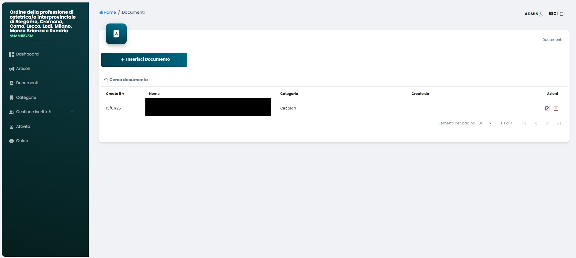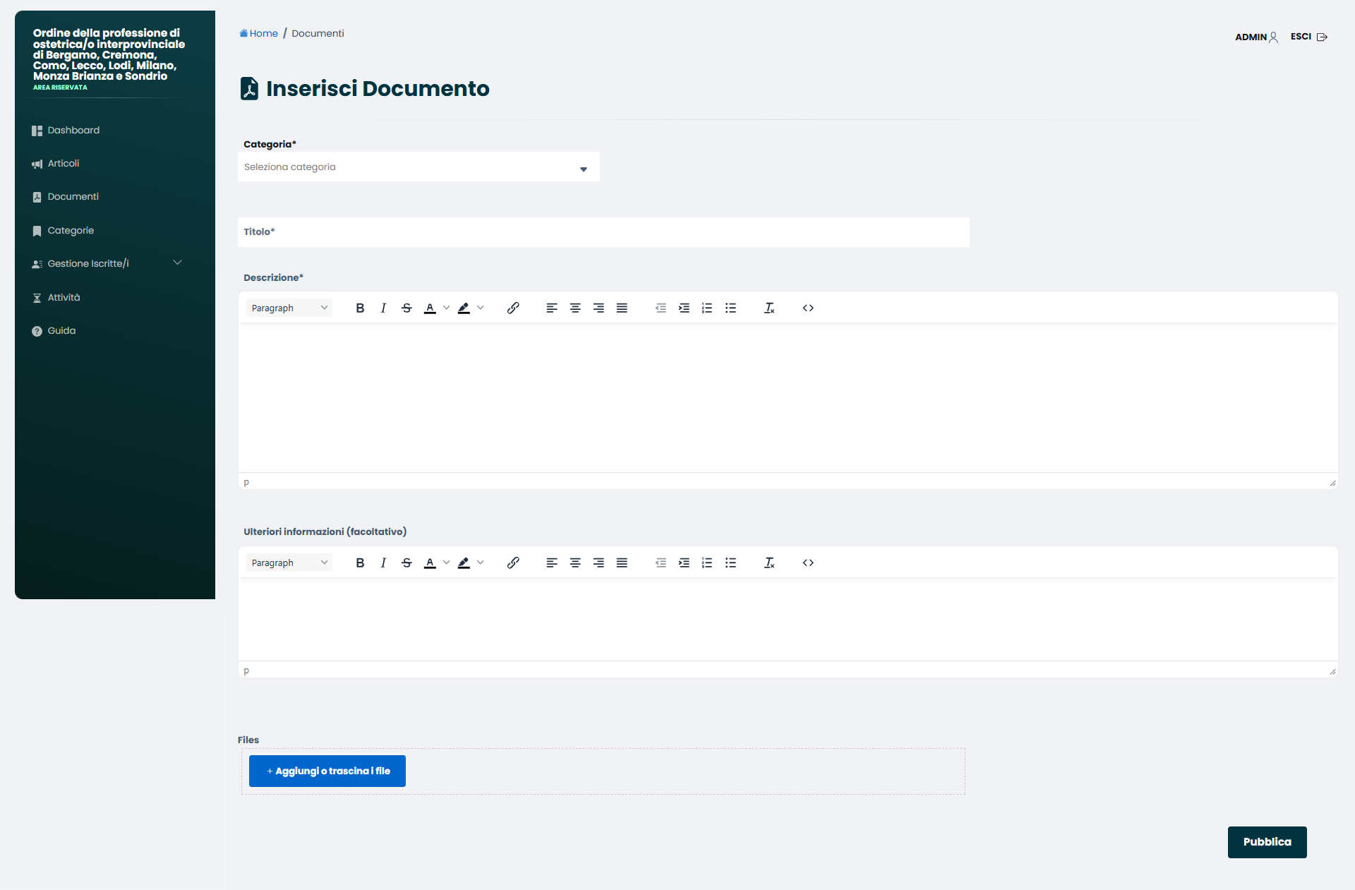 Cliccando su “Documenti”, sempre nel menù di sinistra, è possibile gestire i documenti inseriti per essere visibili solo nell’area riservata per gli utenti.