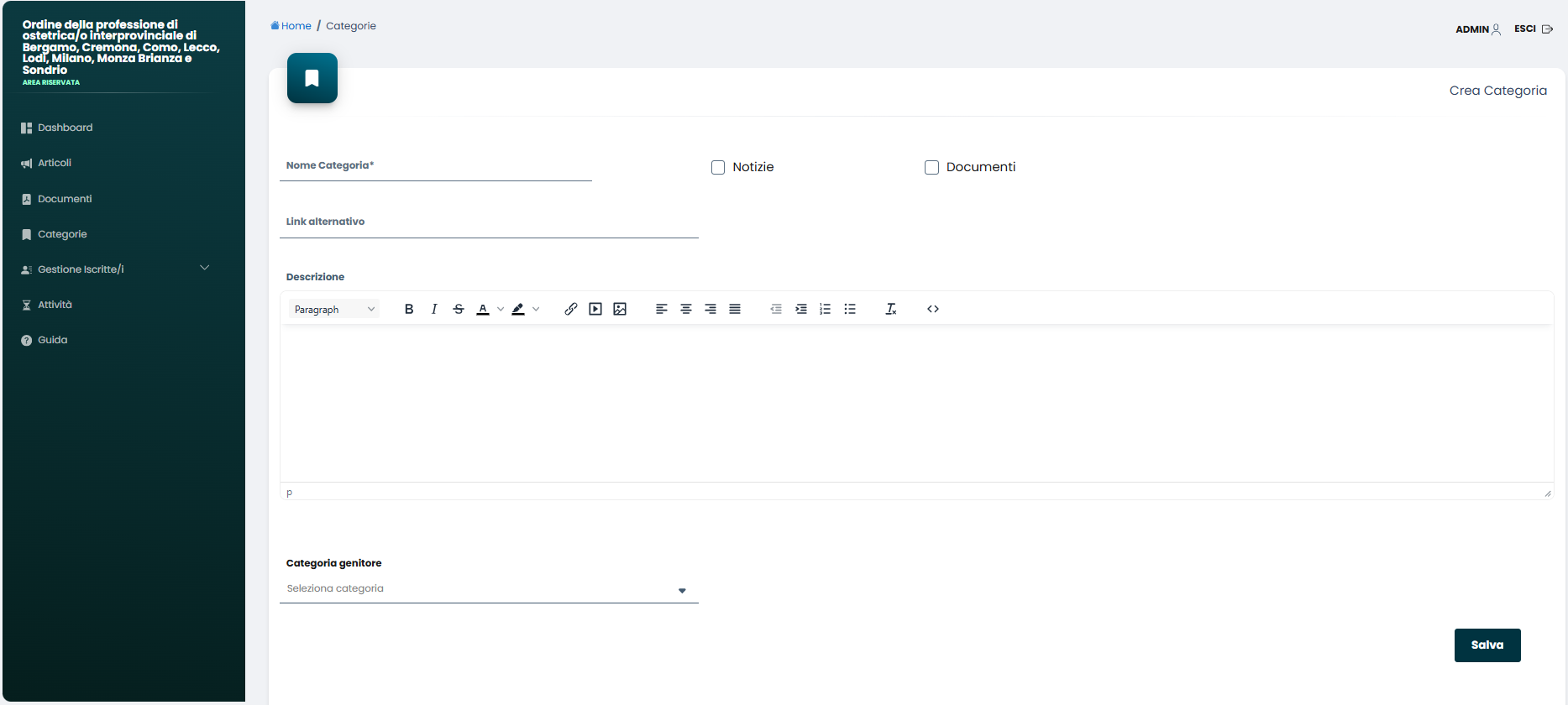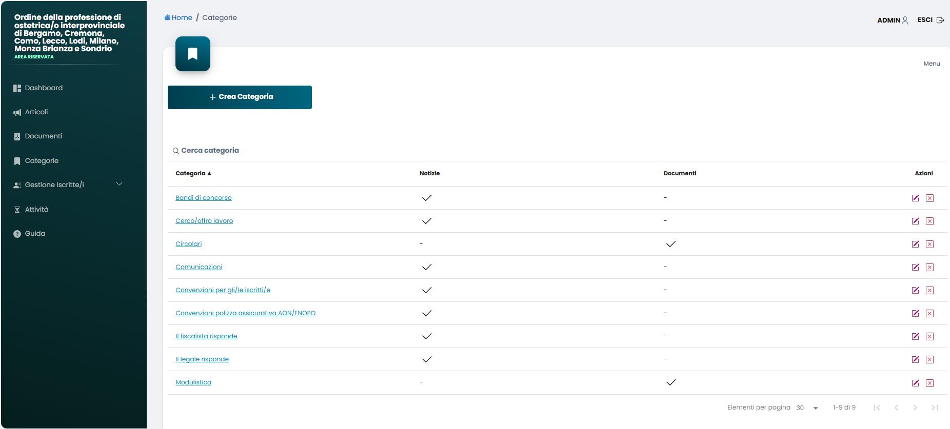 Creando le varie categorie (premendo “Crea Categoria”) o gestendo quelle esistenti (premendo le icone in fondo a ogni riga di categoria) è possibile assegnare alle notizie e ai documenti una categoria specifica in modo da suddividerle al meglio.