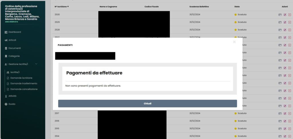 Premendo “Pagamenti” comparirà lo stato dei pagamenti. Premendo “Registra” invece potrete effettivamente registrare e iscrivere l’utente premendo il pulsante “Salva” nella finestra che si apre.