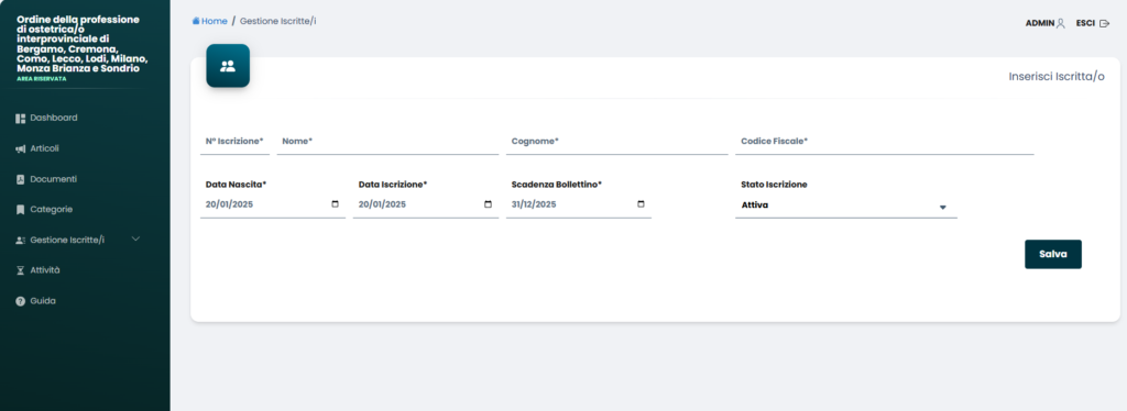 Premendo invece il pulsante in alto “Inserisci Iscritta/o”, si possono inserire i vari dati di un nuovo iscritto.